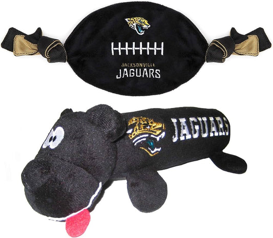 A gift box for pets featuring the Jacksonville Jaguars logo, including two licensed toys, one logo-embossed physical therapy toy, one NFL jersey, one NFL puppy training bell, and one car seat belt.