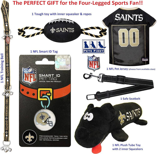 New Orleans Saints NFL Pet Gift Box with 2 Licensed Dog Toys, 1 Logo-Embossed Physical Therapy, 1 NFL Jersey, 1 NFL Puppy Training Bells, and a Car Seat Belt